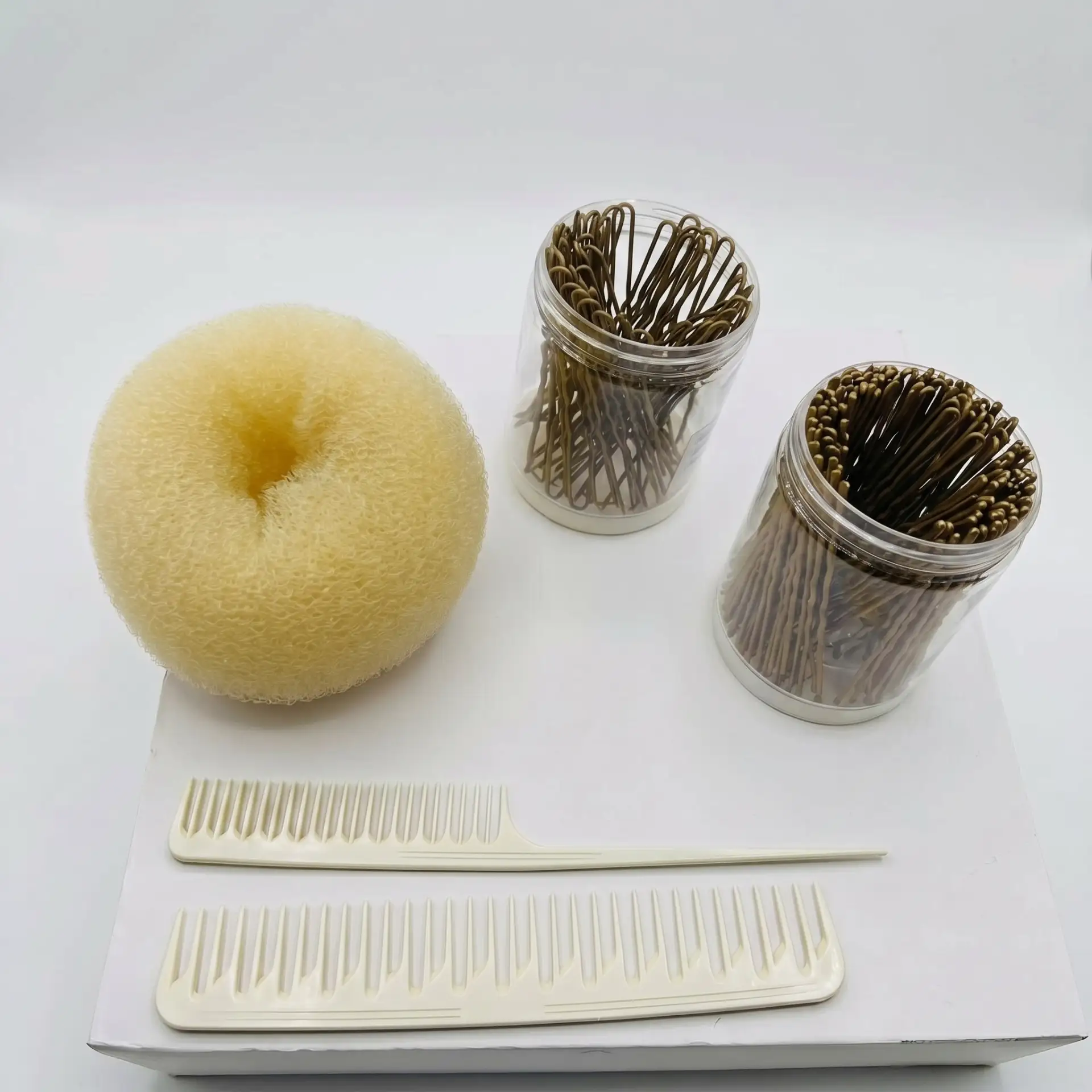 Универсальный набор аксессуаров включает валик для создания объема, профессиональные расчески и комплект шпилек с невидимками для надежной фиксации. С этим готовым решением вы легко создадите прическу любой сложности - от лаконичного пучка до эффектного вечернего образа, обеспечив стойкий и аккуратный результат.