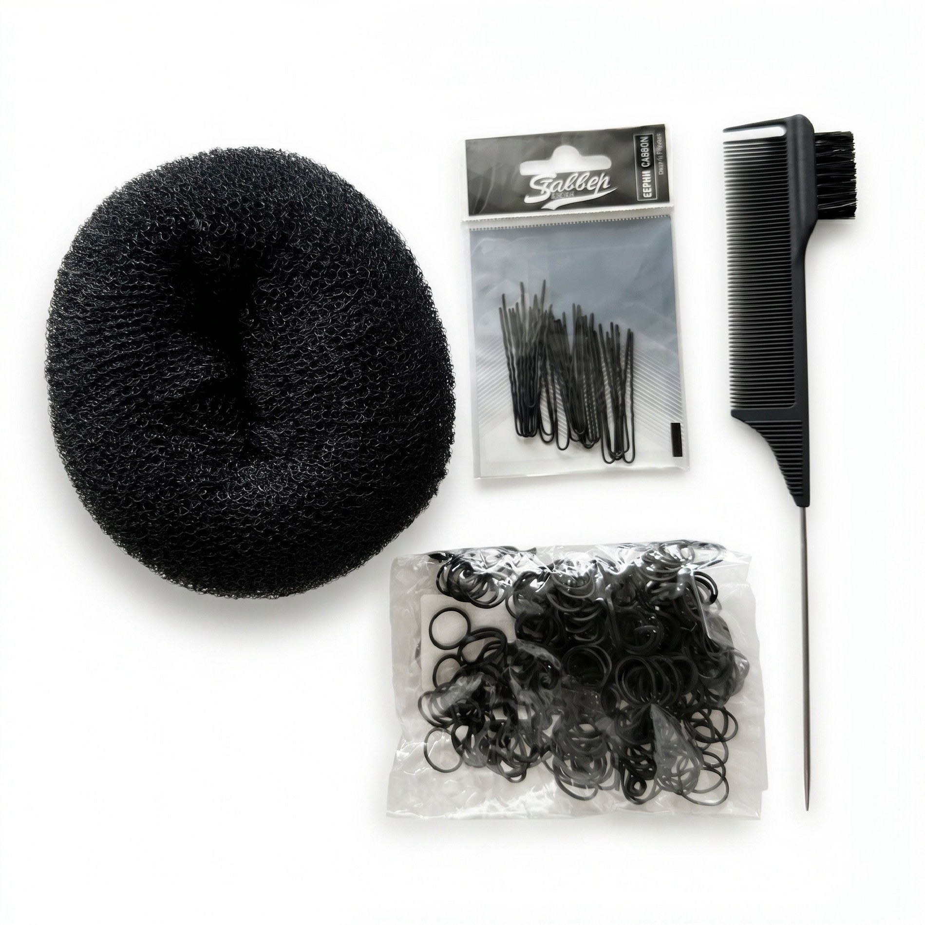 Универсальный набор аксессуаров включает валик для создания объема, профессиональную расческу и комплект шпилек для надежной фиксации. С этим готовым решением вы легко создадите прическу любой сложности - от лаконичного пучка до эффектного вечернего образа, обеспечив стойкий и аккуратный результат.