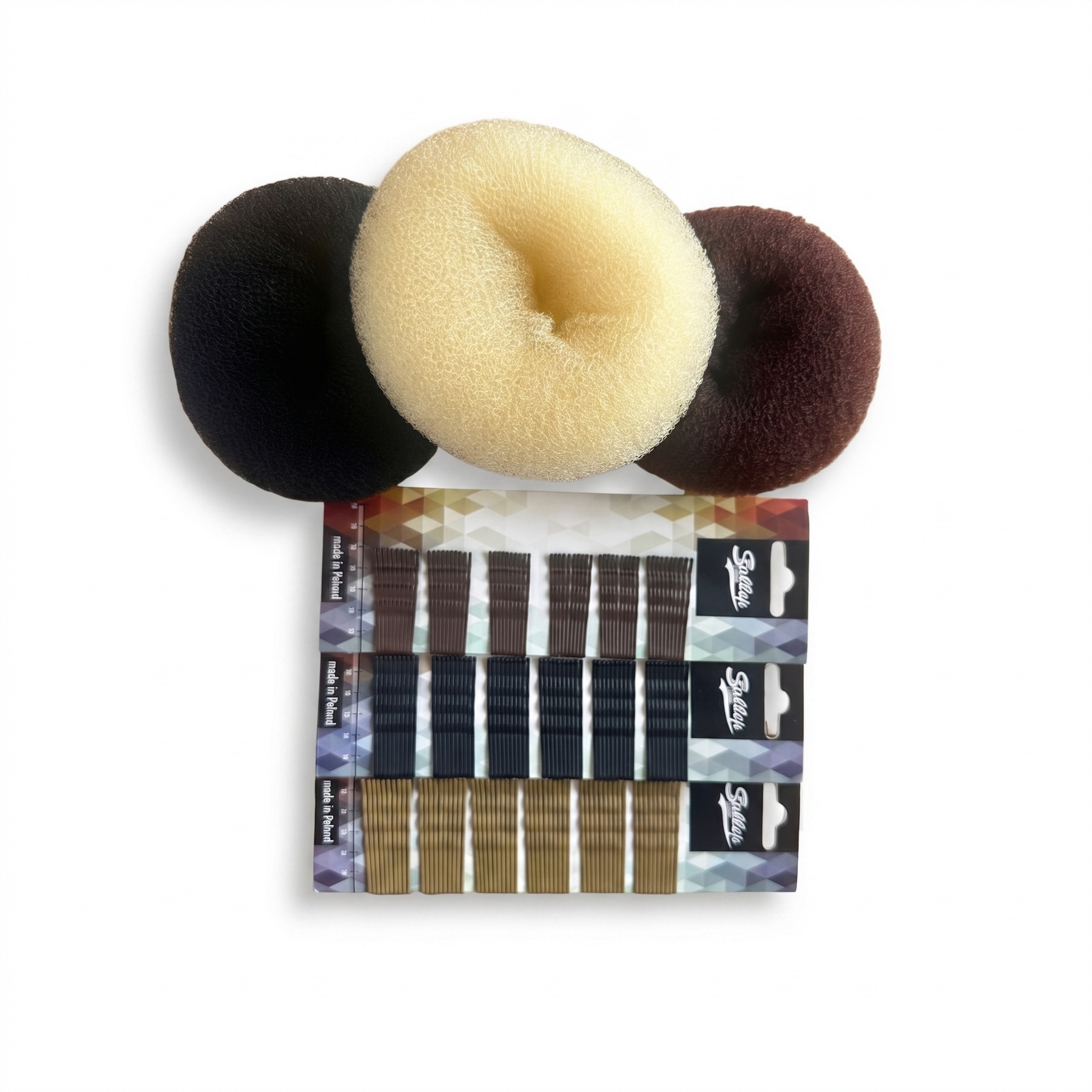 Универсальный набор аксессуаров включает валики для создания объема, профессиональные расчески и комплект с невидимками для надежной фиксации. С этим готовым решением вы легко создадите прическу любой сложности - от лаконичного пучка до эффектного вечернего образа, обеспечив стойкий и аккуратный результат.